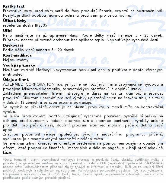 Doporučené použití: Paranit preventivní sprej je určen pro každodenní použití v období zvýšeného rizika výskytu vší. Nastříkejte dostatečné množství spreje rovnoměrně na suché vlasy. Zvláštní pozornost věnujte oblasti za ušima a kolem krku. Nechte vlasy přirozeně uschnout bez použití tepla.