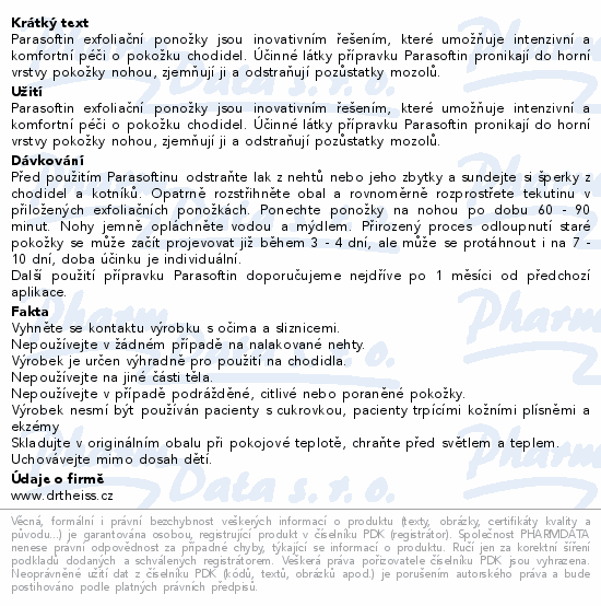 Parasoftin exfoliační ponožky jsou inovativním řešením, které umožňuje intenzivní a komfortní péči o pokožku chodidel. Účinné látky přípravku Parasoftin pronikají do horní vrstvy pokožky nohou, zjemňují ji a odstraňují pozůstatky mozolů.