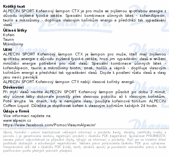 ALPECIN SPORT Kofeinový šampon CTX je pro muže se zvýšenou spotřebou energie z důvodu zvýšené fyzické zátěže. Speciální kombinace účinných látek - kofeinAlpecin, taurin a mikroživiny - doplňuje vlasovým kořínkům energii a předchází tak vypadávání vlasů.