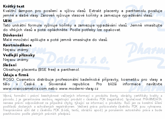 Kvalitní šampon pro posílení a výživu vlasů. Extrakt placenty a panthenolu posiluje jemné a slabé vlasy. Zároveň vyživuje vlasové kořínky a zamezuje vypadávání vlasů.