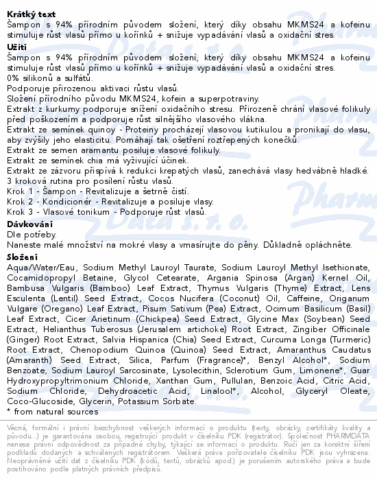 Šampon s 94% přírodním původem složení, který díky obsahu MKMS24 a kofeinu stimuluje růst vlasů přímo u kořínků + snižuje vypadávání vlasů a oxidační stres.