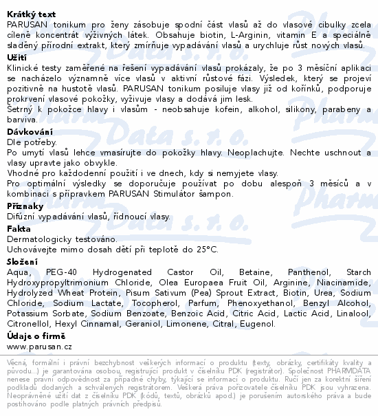 PARUSAN tonikum pro ženy zásobuje spodní část vlasů až do vlasové cibulky zcela cíleně koncentrát výživných látek. Obsahuje biotin, L-Arginin, vitamin E a speciálně sladěný přírodní extrakt, který zmírňuje vypadávání vlasů a urychluje růst nových vlasů.