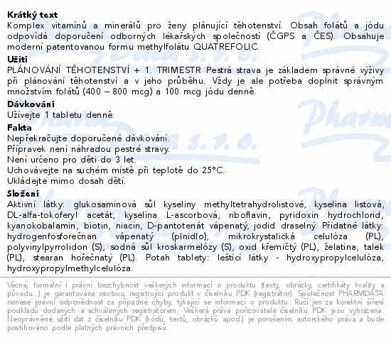 Komplex vitamínů a minerálů pro ženy plánující těhotenství. Obsah folátů a jódu odpovídá doporučení odborných lékařských společností (ČGPS a ČES). Obsahuje moderní patentovanou formu methylfolátu QUATREFOLIC.