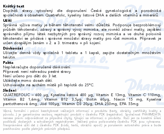 Doplněk stravy vytvořený dle doporučení České gynekologické a porodnické společnosti s obsahem Quatrefolic, kyseliny listové DHA a dalších vitamínů a minerálů.