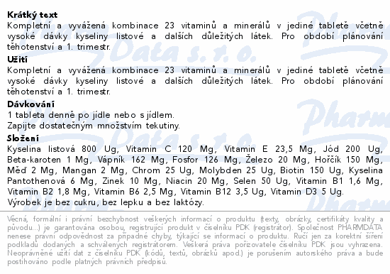 Kompletní a vyvážená kombinace 23 vitaminů a minerálů v jediné tabletě včetně vysoké dávky kyseliny listové a dalších důležitých látek. Pro období plánování těhotenství a 1. trimestr.