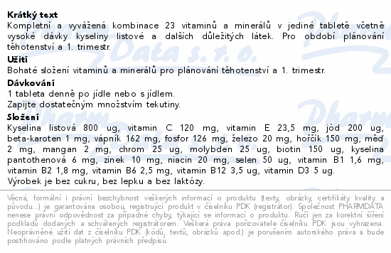 Kompletní a vyvážená kombinace 23 vitaminů a minerálů v jediné tabletě včetně vysoké dávky kyseliny listové a dalších důležitých látek. Pro období plánování těhotenství a 1. trimestr.