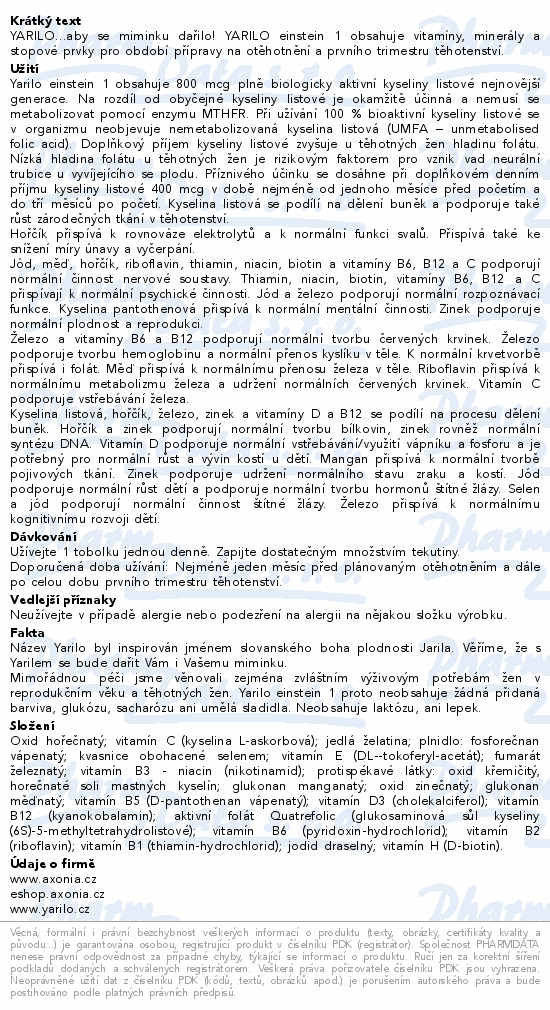YARILO...aby se miminku dařilo! YARILO einstein 1 obsahuje vitamíny, minerály a stopové prvky pro období přípravy na otěhotnění a prvního trimestru těhotenství.