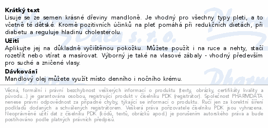 Lisuje se ze semen krásné dřeviny mandloně. Je vhodný pro všechny typy pleti, a to včetně té dětské. Kromě pozitivních účinků na pleť pomáhá při redukčních dietách, při diabetu a reguluje hladinu cholesterolu.