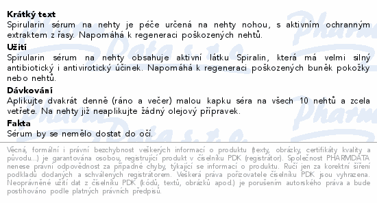 Spirularin sérum na nehty je péče určená na nehty nohou, s aktivním ochranným extraktem z řasy. Napomáhá k regeneraci poškozených nehtů.