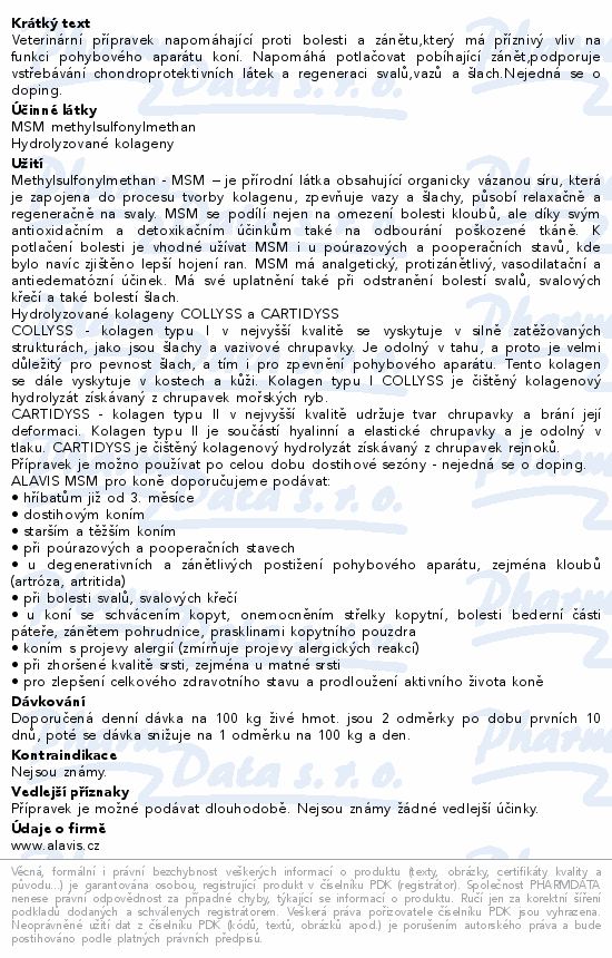 ALAVIS MSM je veterinární preparát určený pro koně a pony. Působí proti zánětu a bolesti, na zpevnění vazů a šlach a na regeneraci a relaxaci svalů. Dále podporuje kvalitu kůže a srsti. Prokazatelně zlepšuje fyzickou výkonnost. Nejedná se o doping.