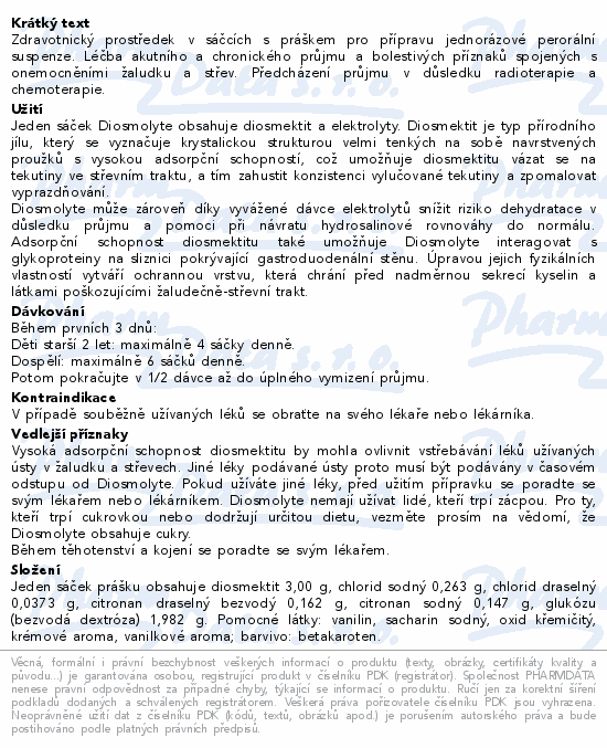 Zdravotnický prostředek v sáčcích s práškem pro přípravu jednorázové perorální suspenze. Léčba akutního a chronického průjmu a bolestivých příznaků spojených s onemocněními žaludku a střev. Předcházení průjmu v důsledku radioterapie a chemoterapie.