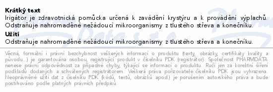 Irigátor je zdravotnická pomůcka určená k zavádění krystýru a k provádění výplachů. Odstraňuje nahromaděné nežádoucí mikroorganismy z tlustého střeva a konečníku.