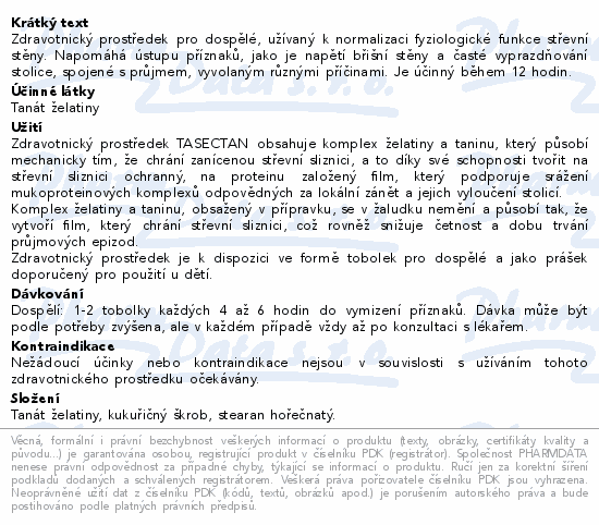 Tasectan 500 mg tobolky jsou zdravotnický prostředek navržený k podpoře zvládání akutního průjmu. Obsahují želatinový tanát, který působí přímo na střevní sliznici, kde vytváří ochrannou vrstvu a napomáhá obnově její přirozené funkce. Díky svému složení Tasectan nepůsobí systémově a je určen pro dospělé a dospívající od 14 let.