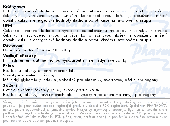 Čekanko javorové sladidlo je vyrobené patentovanou metodou z extraktu z kořene čekanky a javorového sirupu. Unikátní kombinací dvou složek je dosaženo snížení obsahu cukru a energetické hodnoty sladidla oproti čistému javorovému sirupu.