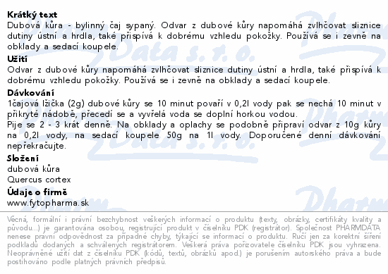 Dubová kůra - bylinný čaj sypaný. Odvar z dubové kůry napomáhá zvlhčovat sliznice dutiny ústní a hrdla, také přispívá k dobrému vzhledu pokožky. Používá se i zevně na obklady a sedací koupele.