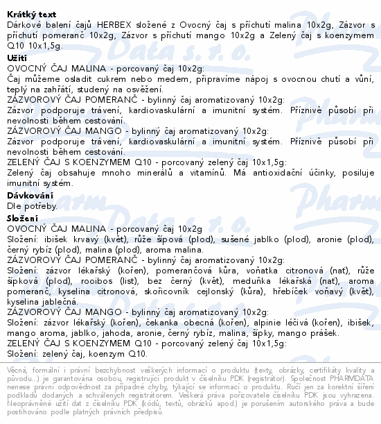 Dárkové balení čajů HERBEX složené z Ovocný čaj s příchutí malina 10x2g, Zázvor s příchutí pomeranč 10x2g, Zázvor s příchutí mango 10x2g a Zelený čaj s koenzymem Q10 10x1,5g.