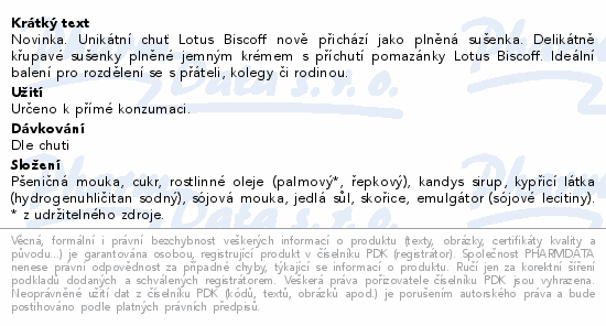 Novinka. Unikátní chuť Lotus Biscoff nově přichází jako plněná sušenka. Delikátně křupavé sušenky plněné jemným krémem s příchutí pomazánky Lotus Biscoff. Ideální balení pro rozdělení se s přáteli, kolegy či rodinou.