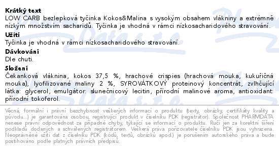 LOW CARB bezlepková tyčinka Kokos&Malina s vysokým obsahem vlákniny a extrémně nízkým množstvím sacharidů. Tyčinka je vhodná v rámci nízkosacharidového stravování.