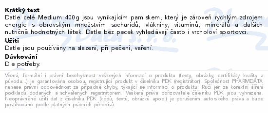 Datle celé Medium 400g jsou vynikajícím pamlskem, který je zároveň rychlým zdrojem energie s obrovským množstvím sacharidů, vlákniny, vitamínů, minerálů a dalších nutričně hodnotných látek. Datle bez pecek vyhledávají často i vrcholoví sportovci.