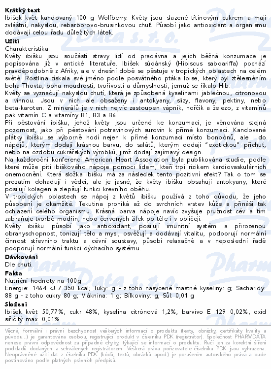 Ibišek květ kandovaný 100 g Wolfberry. Květy jsou slazené třtinovým cukrem a mají zvláštní, nakyslou, rebarborovo-brusinkovou chuť. Působí jako antioxidant a organismu dodávají celou řadu důležitých látek.