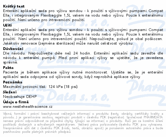 Enterální aplikační sada pro výživu sondou - k použití s výživovými pumpami Compat Ella, i integrovaným Flexibaggle 1,5L vakem na vodu nebo výživu. Pouze k enterálnímu použití. Není určeno pro intravenózní použití.