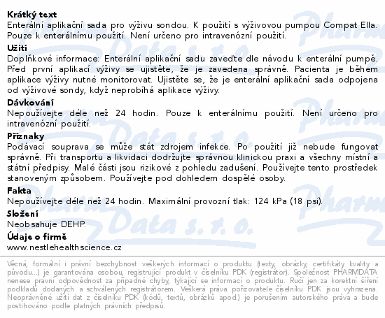 Enterální aplikační sada pro výživu sondou. K použití s výživovou pumpou Compat Ella. Pouze k enterálnímu použití. Není určeno pro intravenózní použití.