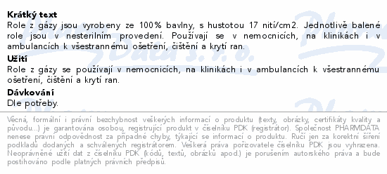 Role z gázy jsou vyrobeny ze 100% bavlny, s hustotou 17 nití/cm2. Jednotlivě balené role jsou v nesterilním provedení. Používají se v nemocnicích, na klinikách i v ambulancích k všestrannému ošetření, čištění a krytí ran.