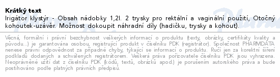 Irigátor klystýr - Obsah nádobky 1,2l. 2 trysky pro rektální a vaginální použití, Otočný kohoutek-uzávěr. Možnost dokoupit náhradní díly (hadičku, trysky a kohout).