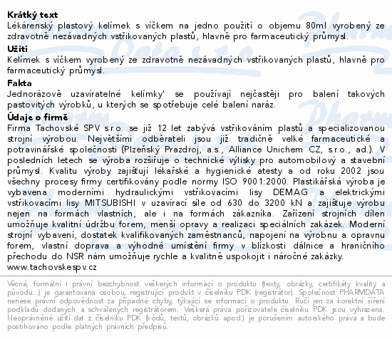 Lékárenský plastový kelímek s víčkem na jedno použití o objemu 80ml vyrobený ze zdravotně nezávadných vstřikovaných plastů, hlavně pro farmaceutický průmysl.