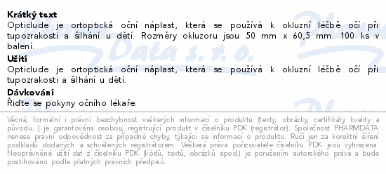Opticlude je ortoptická oční náplast, která se používá k okluzní léčbě očí při tupozrakosti a šilhání u dětí. Rozměry okluzoru jsou 50 mm x 60,5 mm. 100 ks v balení.