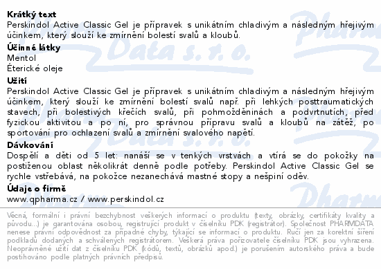Perskindol Active Classic Gel je přípravek s unikátním chladivým a následným hřejivým účinkem, který slouží ke zmírnění bolestí svalů a kloubů.