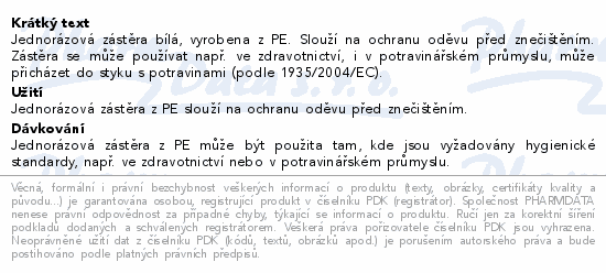 Jednorázová zástěra bílá, vyrobena z PE. Slouží na ochranu oděvu před znečištěním. Zástěra se může používat např. ve zdravotnictví, i v potravinářském průmyslu, může přicházet do styku s potravinami (podle 1935/2004/EC).