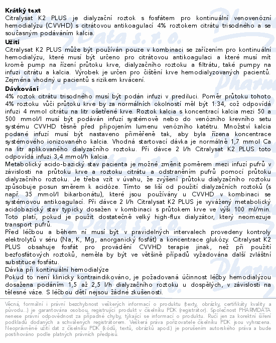 Citralysat K2 PLUS je dialyzační roztok s fosfátem pro kontinuální venovenózní hemodialýzu (CVVHD) s citrátovou antikoagulací 4% roztokem citrátu trisodného a se současným podáváním kalcia.