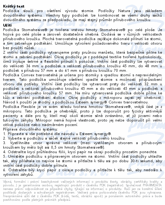 Podložka slouží pro ošetření vývodu stomie. Podložky Natura jsou základem dvoudílného systému. Všechny typy podložek lze kombinovat se všemi druhy sáčků dvoudílného systému za předpokladu, že mají stejný průměr přírubového kroužku.