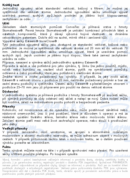 Jednodílný výpustný sáček standardní velikosti, béžový s filtrem. Je možné jej vystřihnout dle velikosti stomie. Jednoduché vypouštění sáčku umožňuje výpusť uzavíráná pomocí suchých zipů.Jejich uvolnění je jištěno krycí klopou-zamezí zachytávání za oděv.