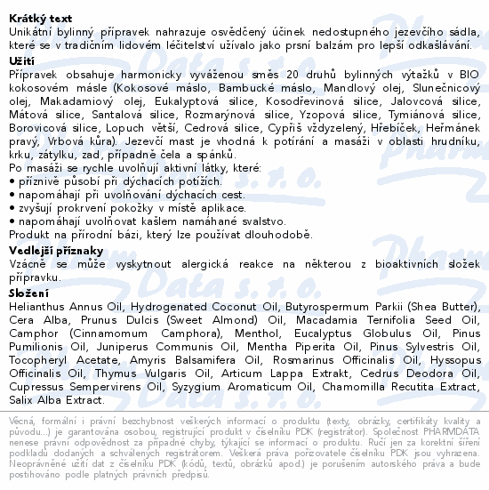 Unikátní bylinný přípravek nahrazuje osvědčený účinek nedostupného jezevčího sádla, které se v tradičním lidovém léčitelství užívalo jako prsní balzám pro lepší odkašlávání.