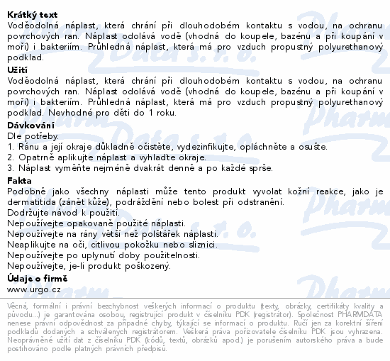 Voděodolná náplast, která chrání při dlouhodobém kontaktu s vodou, na ochranu povrchových ran. Náplast odolává vodě (vhodná do koupele, bazénu a při koupání v moři) i bakteriím. Průhledná náplast, která má pro vzduch propustný polyurethanový podklad.