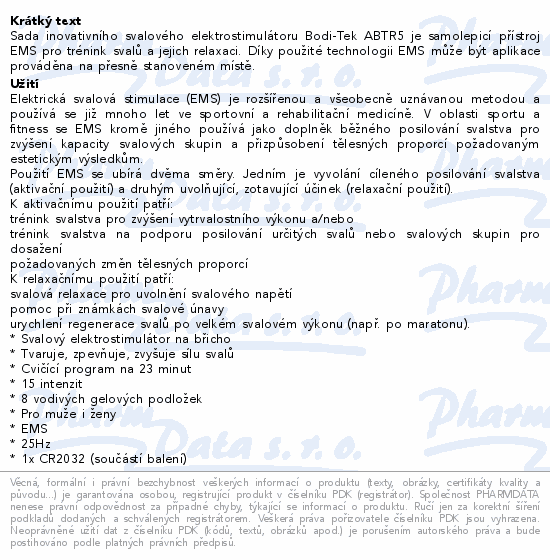 Sada inovativního svalového elektrostimulátoru Bodi-Tek ABTR5 je samolepicí přístroj EMS pro trénink svalů a jejich relaxaci. Díky použité technologii EMS může být aplikace prováděna na přesně stanoveném místě.