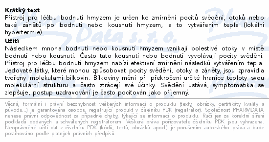 Přístroj pro léčbu bodnutí hmyzem je určen ke zmírnění pocitů svědění, otoků nebo také zánětů po bodnutí nebo kousnutí hmyzem, a to vytvářením tepla (lokální hypertermie).