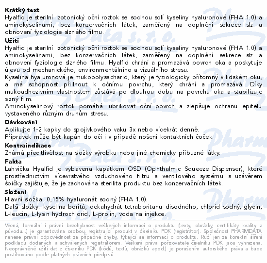 Hyalfid je sterilní izotonický oční roztok se sodnou solí kyseliny hyaluronové (FHA 1.0) a aminokyselinami, bez konzervačních látek, zaměřený na doplnění sekrece slz a obnovení fyziologie slzného filmu.