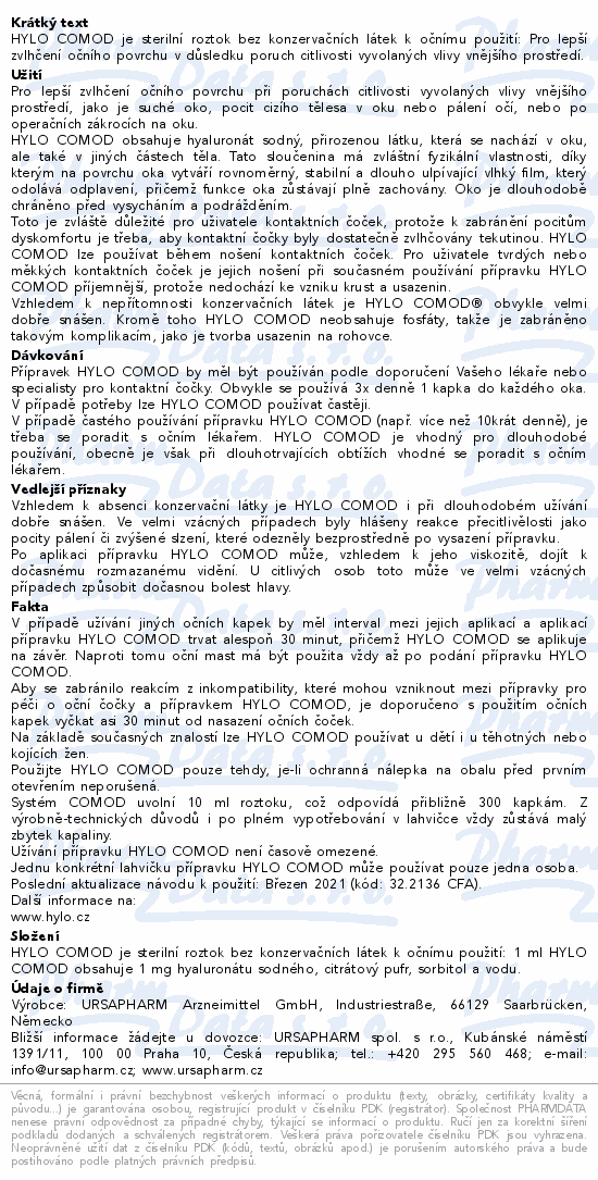 HYLO COMOD® je sterilní roztok bez konzervačních látek k očnímu použití: Pro lepší zvlhčení očního povrchu v důsledku poruch citlivosti vyvolaných vlivy vnějšího prostředí.
