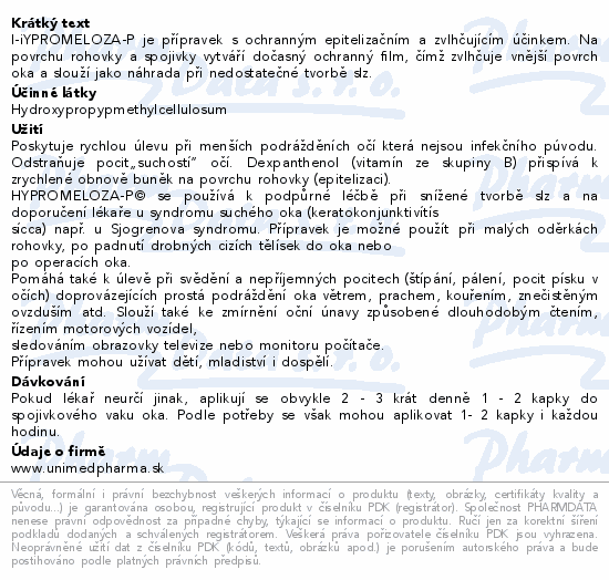 l-iYPROMELOZA-P je přípravek s ochranným epitelizačním a zvlhčujícím účinkem. Na povrchu rohovky a spojivky vytváří dočasný ochranný film, čímž zvlhčuje vnější povrch oka a slouží jako náhrada při nedostatečné tvorbě slz.