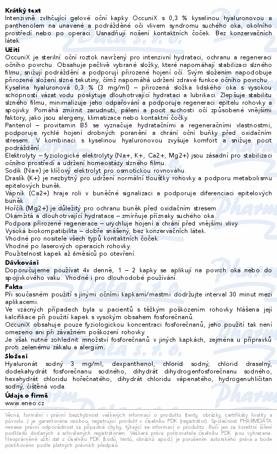 Intenzivně zvlhčující gelové oční kapky OccuniX s 0,3 % kyselinou hyaluronovou a panthenolem na unavené a podrážděné oči vlivem syndromu suchého oka, okolního prostředí nebo po operaci. Usnadňují nošení kontaktních čoček. Bez konzervačních látek.