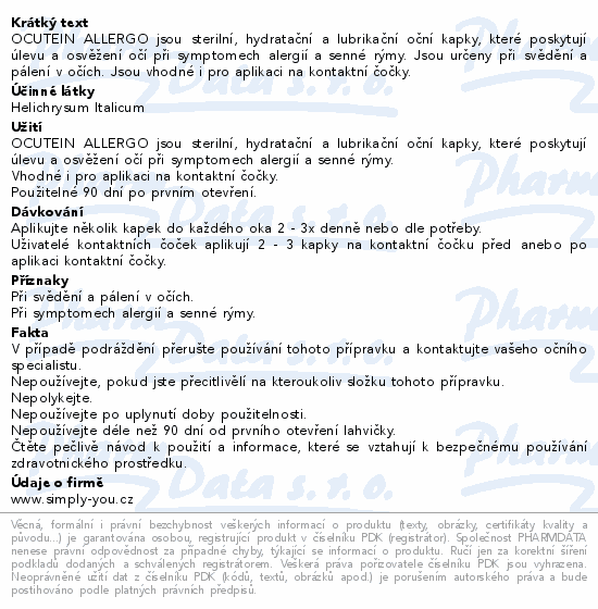 OCUTEIN ALLERGO jsou sterilní, hydratační a lubrikační oční kapky, které poskytují úlevu a osvěžení očí při symptomech alergií a senné rýmy. Jsou určeny při svědění a pálení v očích. Jsou vhodné i pro aplikaci na kontaktní čočky.
