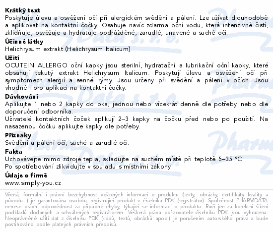 Poskytuje úlevu a osvěžení očí při alergickém svědění a pálení. Lze užívat dlouhodobě a aplikovat na kontaktní čočky. Osahuje navíc zdarma oční vodu, která intenzivně čistí, zklidňuje, osvěžuje a hydratuje podrážděné, zarudlé, unavené a suché oči.