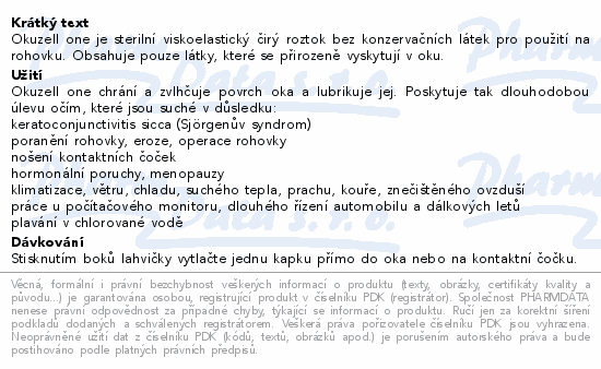 Okuzell one je sterilní viskoelastický čirý roztok bez konzervačních látek pro použití na rohovku. Obsahuje pouze látky, které se přirozeně vyskytují v oku.