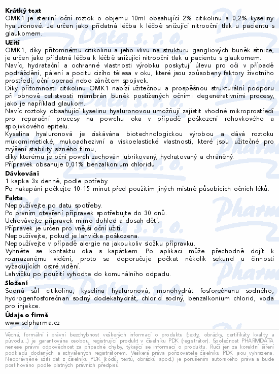 OMK1 je sterilní oční roztok o objemu 10 ml obsahující 2% citikolinu a 0,2% kyseliny hyaluronové. Je určen jako přídatná léčba k léčbě snižující nitrooční tlak u pacientu s glaukomem.
