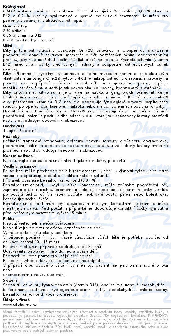 OMK2 je sterilní oční roztok o objemu 10 ml obsahující 2 % citikolinu, 0,05 % vitaminu B12 a 0,2 % kyseliny hyaluronové o vysoké molekulové hmotnosti. Je určen pro pacienty s počínající diabetickou retinopatií.