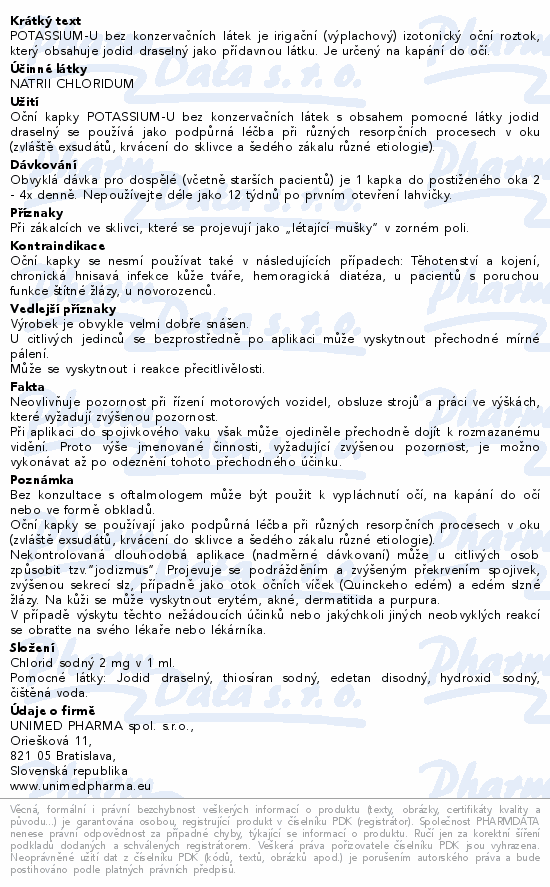 POTASSIUM-U bez konzervačních látek je irigační (výplachový) izotonický oční roztok, který obsahuje jodid draselný jako přídavnou látku. Je určený na kapání do očí.