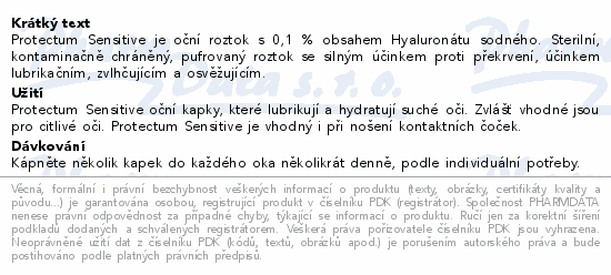 Protectum Sensitive je oční roztok s 0,1 % obsahem Hyaluronátu sodného. Sterilní, kontaminačně chráněný, pufrovaný roztok se silným účinkem proti překrvení, účinkem lubrikačním, zvlhčujícím a osvěžujícím.
